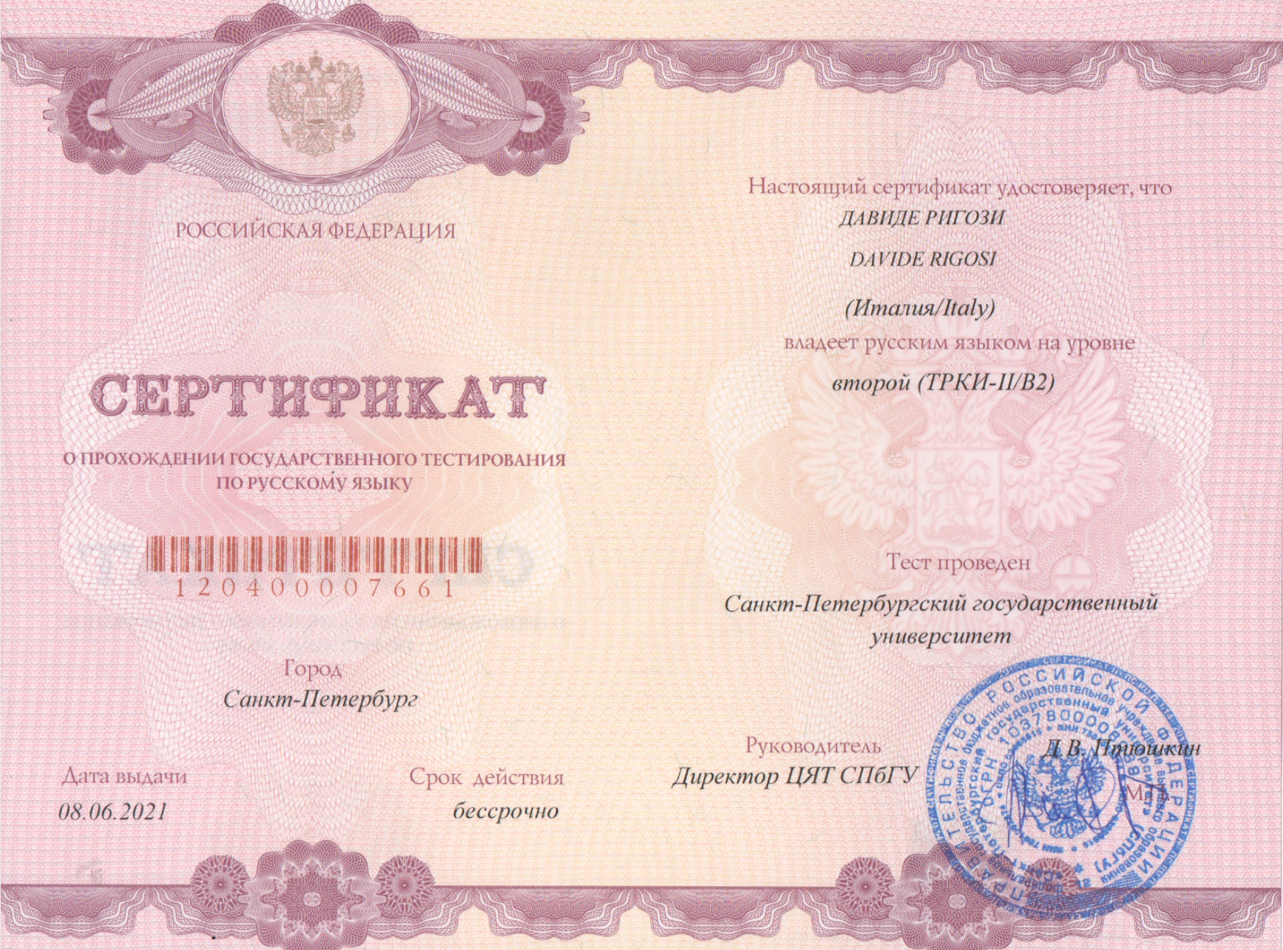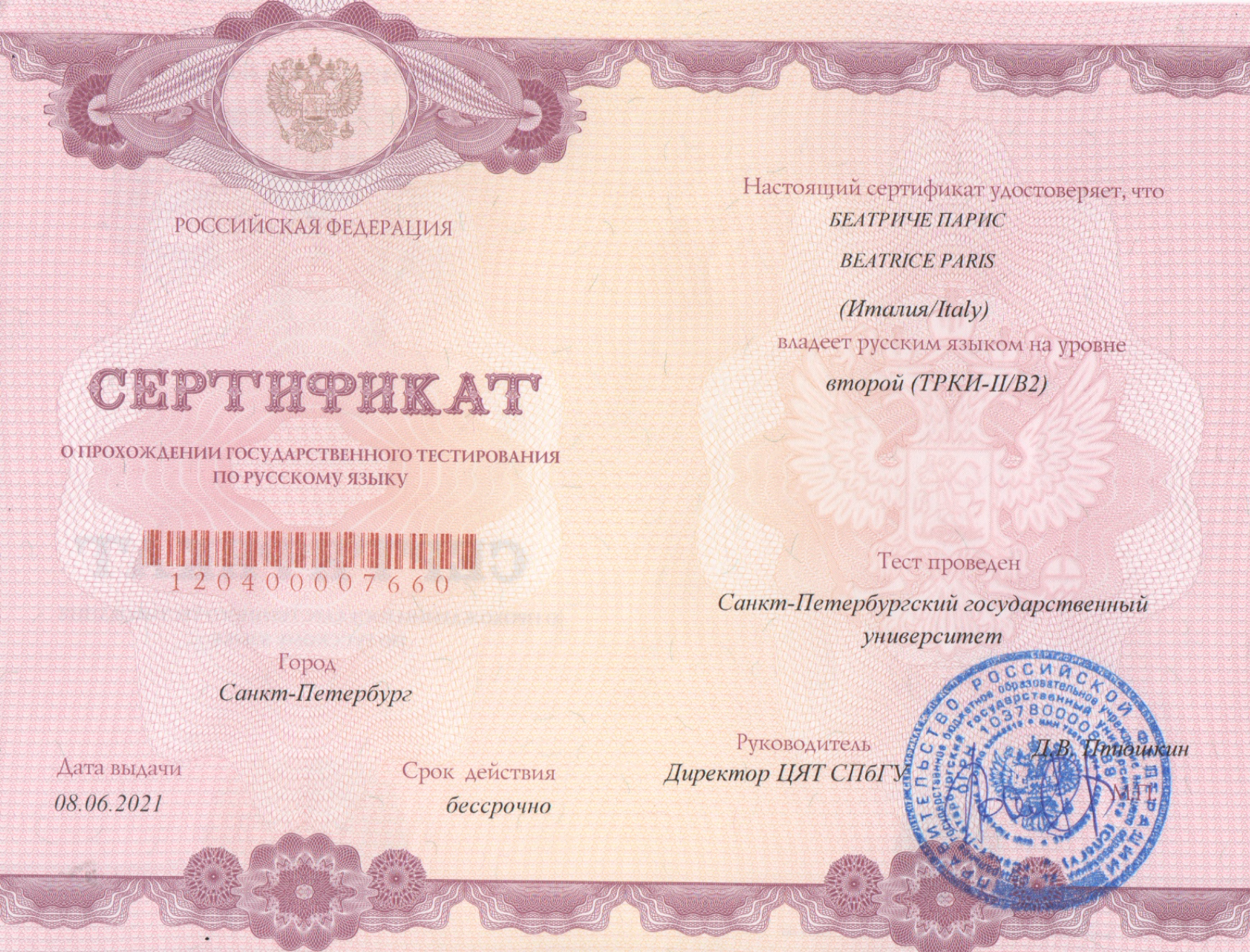 Possiedo, oltre al diploma universitario, anche i certificati appositi per l’insegnamento di russo per principianti, intermedi e avanzati;